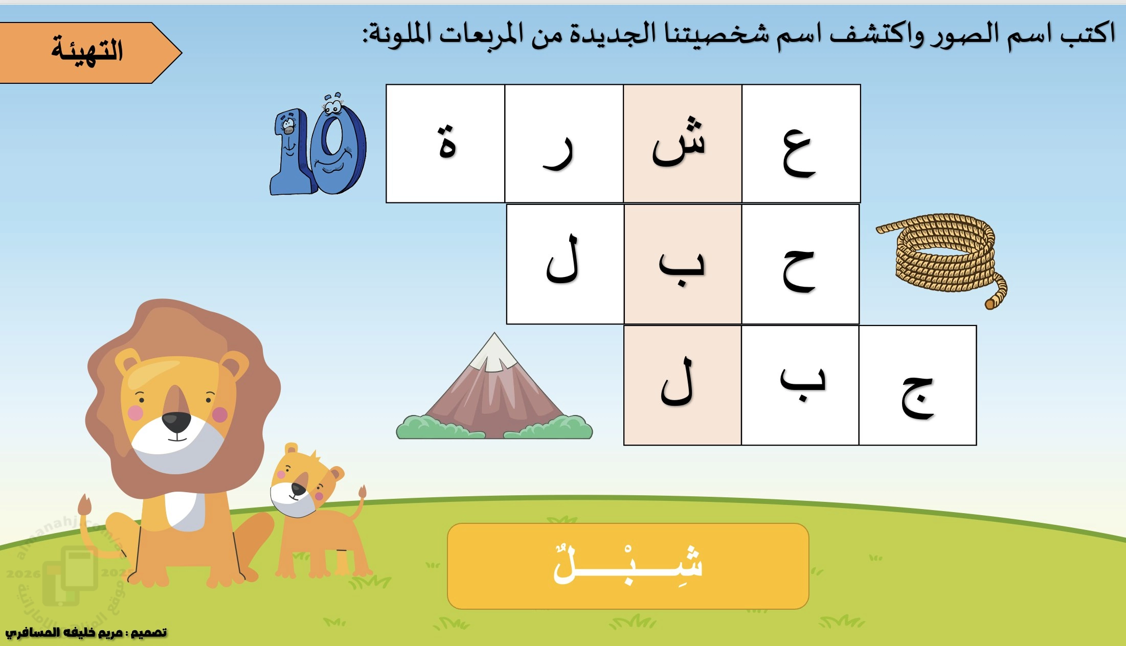 - تهيئة بصريّة وصوتيّة يكتب فيها المتعلم أسماء الصور لاكتشاف شخصية القصة الجديدة. يمثّل الملف مادة تعليمية مناسبة لحصص اللغة العربية في الصفوف الأولى، ويُمكن استخدامه لتنمية مهارات القراءة، الاستماع، والتحليل بطريقة ممتعة وجاذبة للطلاب. | |||