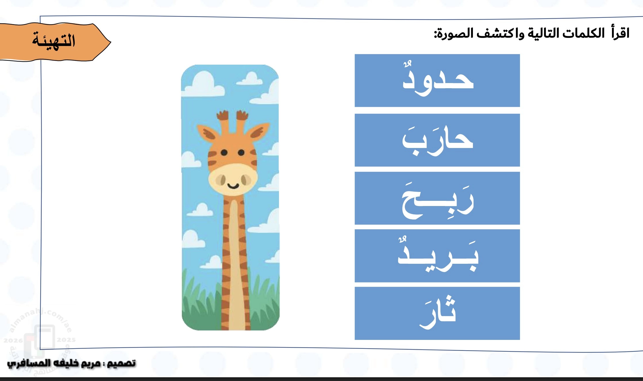 - تهيئة تعتمد على قراءة كلمات مثل: حدود – حارب – ربح – بريد – ثار ثم اكتشاف الصورة المناسبة، لتعزيز مهارة الربط بين الكلمة والمعنى. الملف مناسب لطلاب الصف الأول ويصلح للاستخدام في الحصة الصفية، أو كواجب منزلي، أو ضمن أنشطة تعزيز القراءة والتمييز الصوتي. | ||