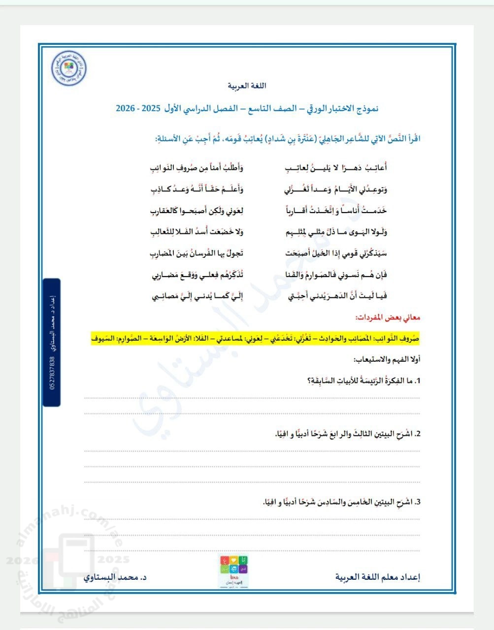 | نموذج الاختبار الورقي وفق الهيكل الوزاري الجديد - إعداد: محمد البستاوي | ||