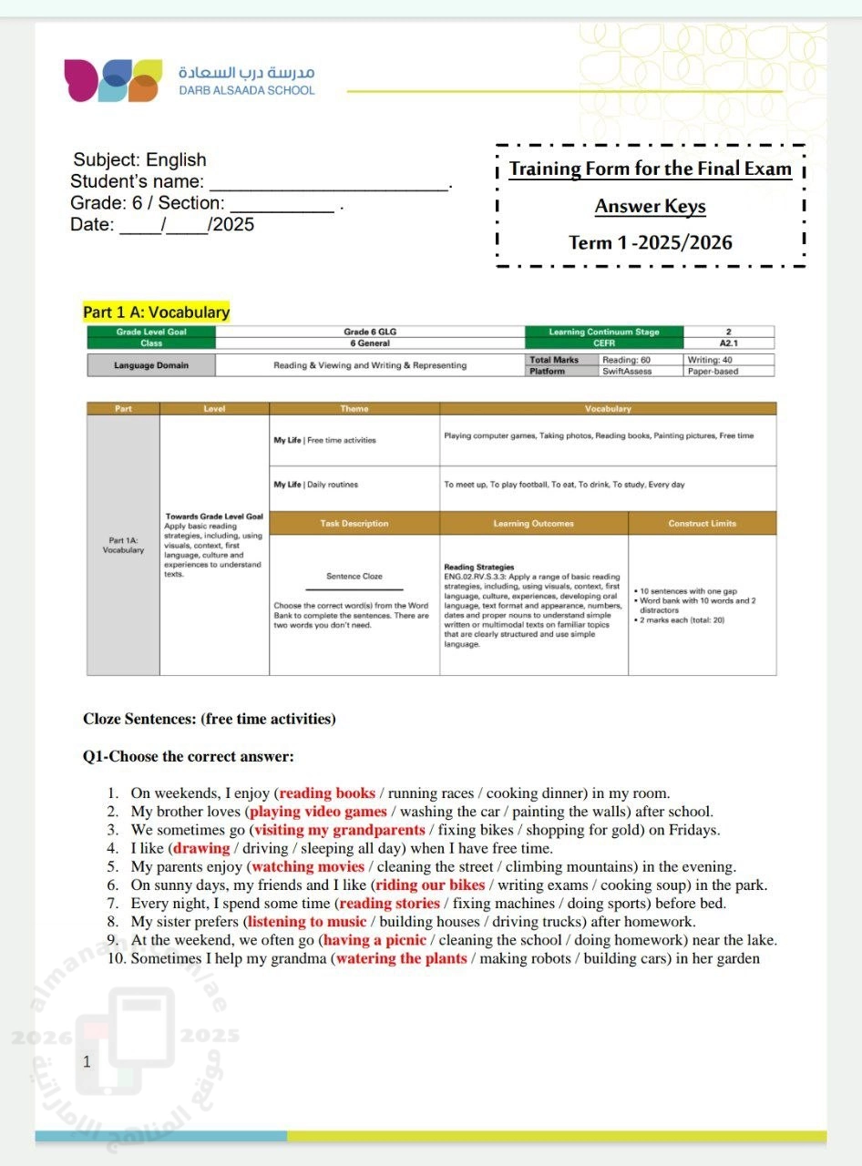 نموذج الأسئلة من الرابط التالي : https://almanahj.com/ae/id=36607 | ||