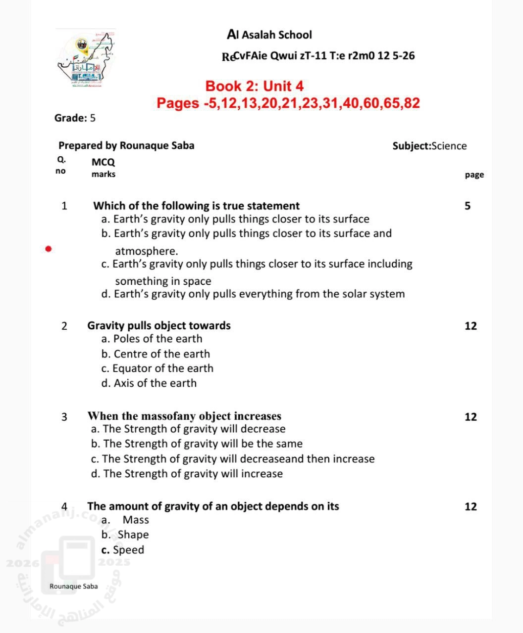 5. علوم, الفصل الأول, 2025-2026, حل مراجعة نهائية وفق الهيكل الوزاري الجديد منهج انسباير