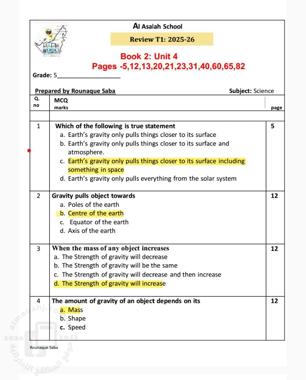 4. علوم, الفصل الأول, 2025-2026, تجميعة مراجعة وفق الهيكل الوزاري الجديد منهج انسباير بدون الحل