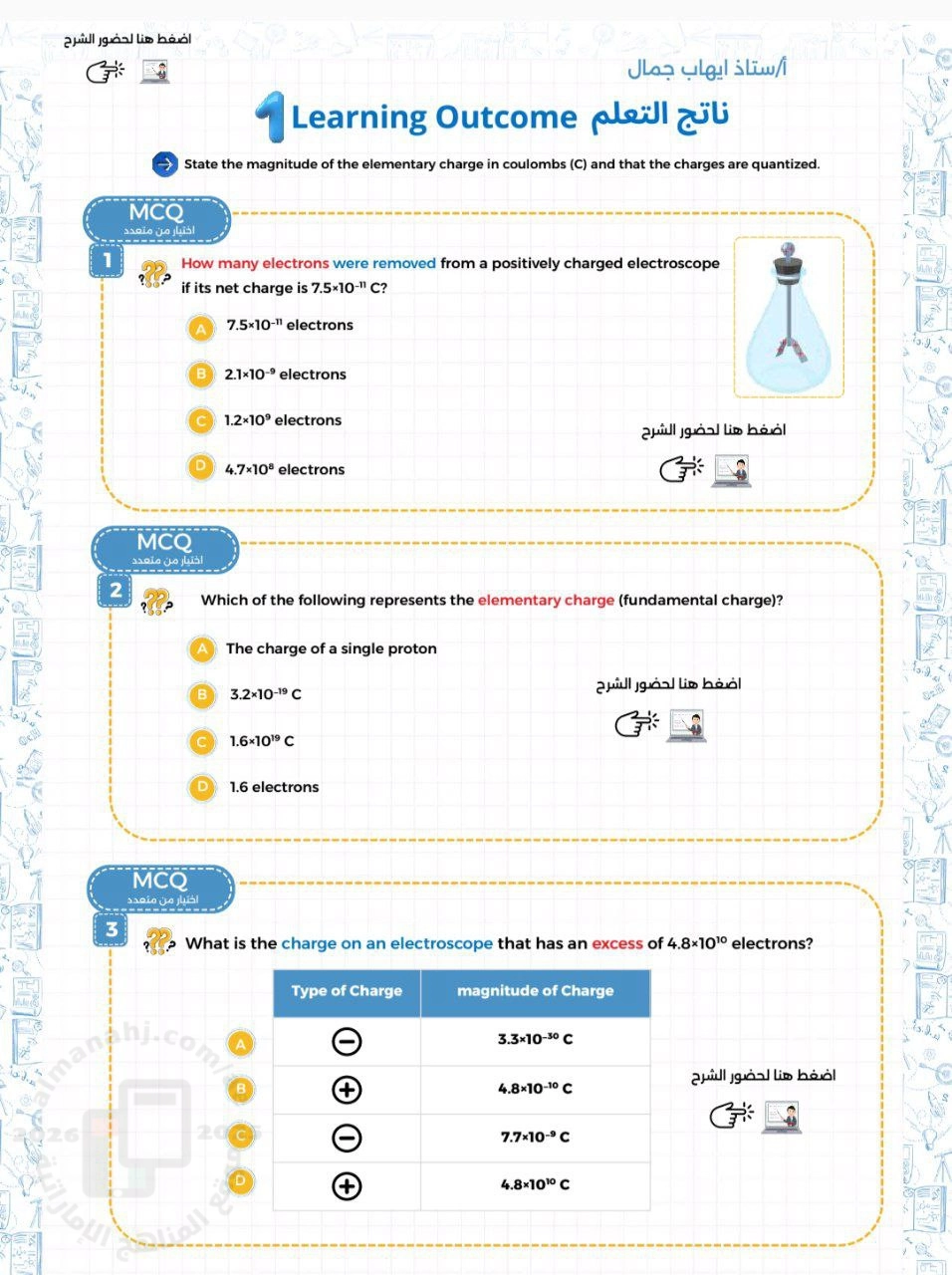 9. أوراق عمل الوحدة الأولى الكهرباء الساكنة باللغتين العربية والانجليزية
