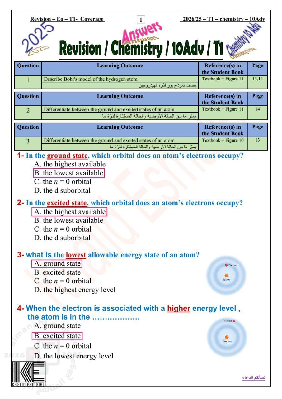 13. الصف العاشر المتقدم, كيمياء, مراجعة نهائية وفق الهيكل الوزاري الجديد منهج انسباير