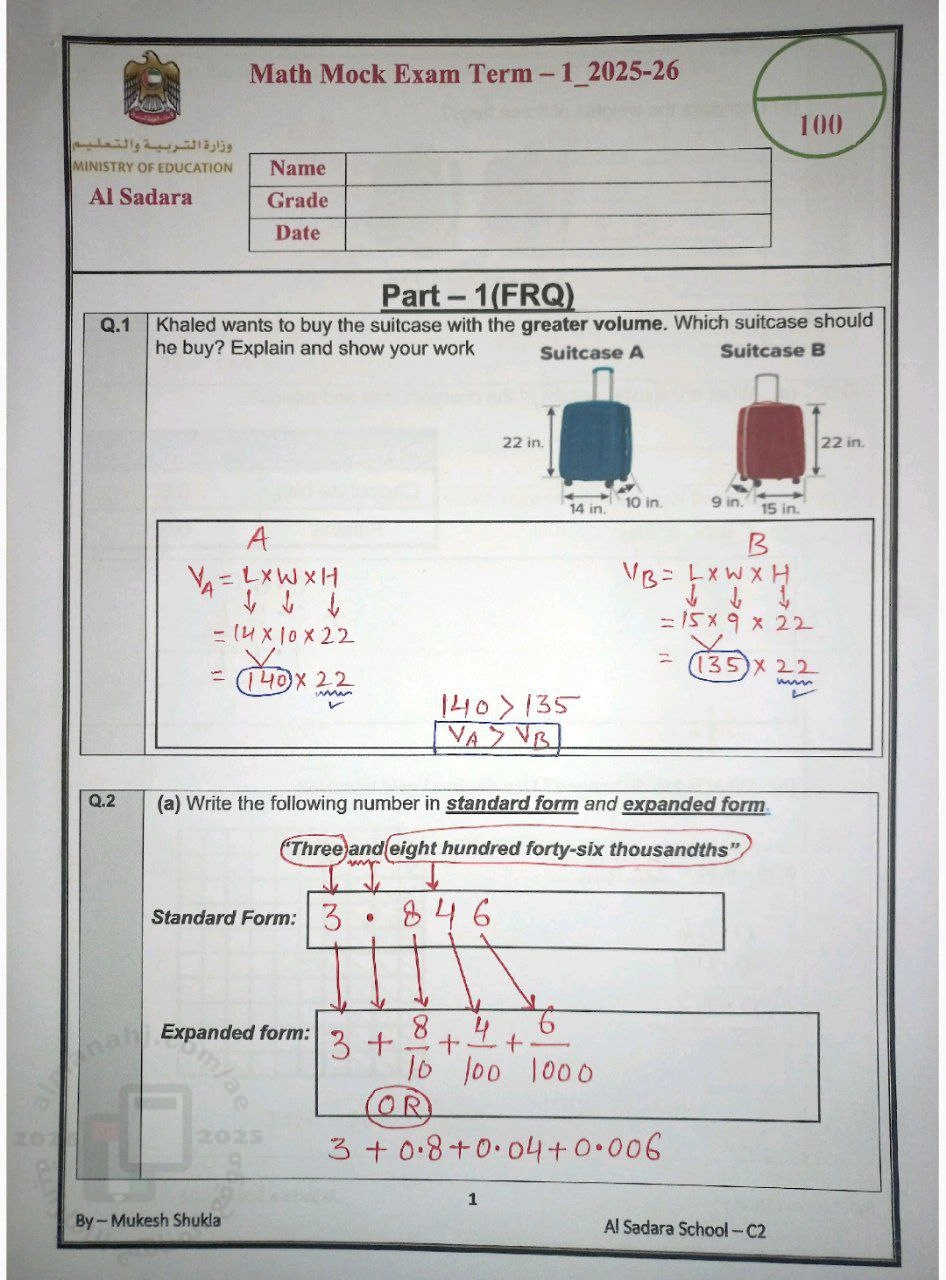 3. الصف الخامس, رياضيات, حل اختبار تجريبي Mock Exam وفق الهيكل الوزاري الجديد منهج ريفيل