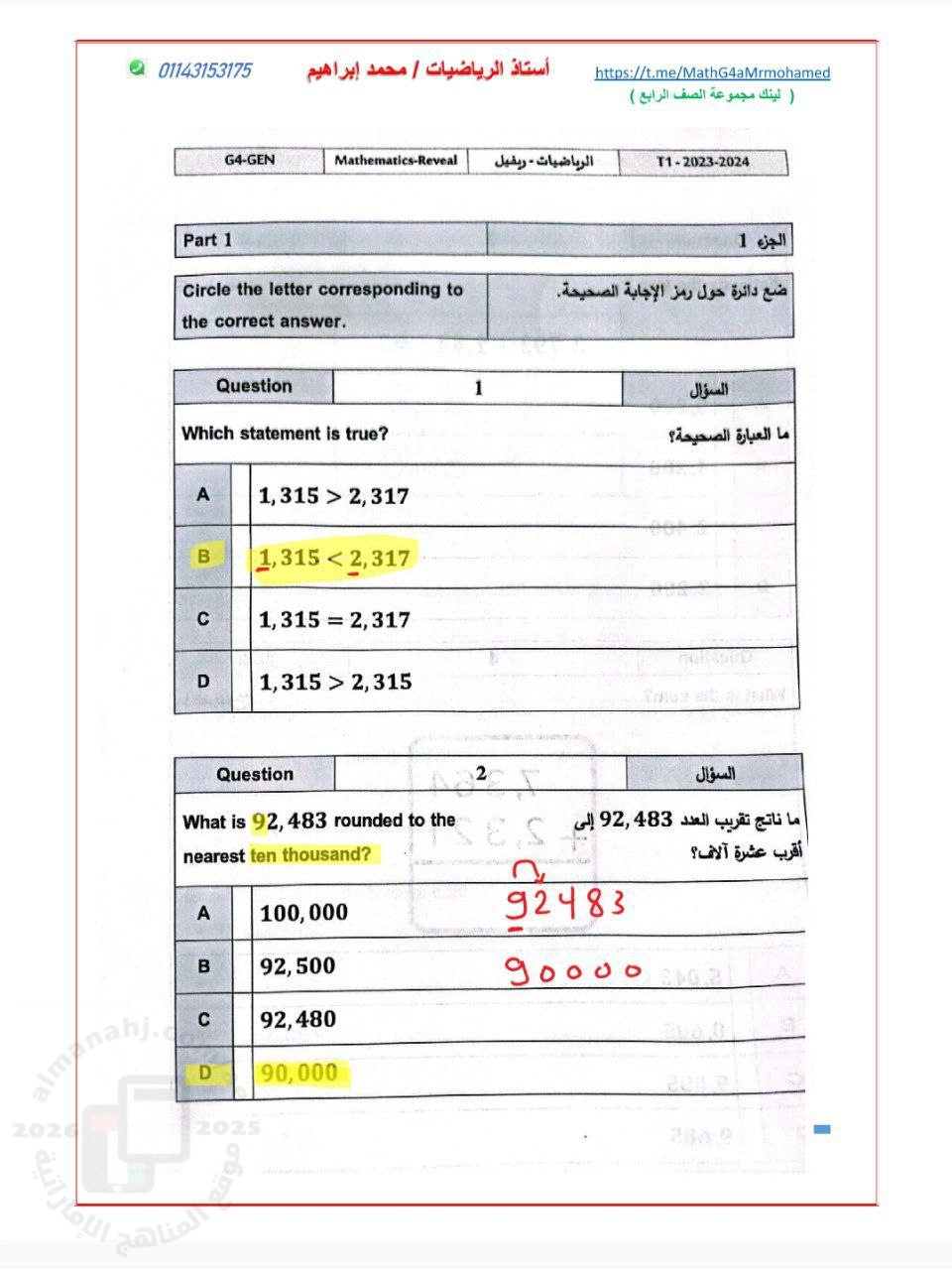 1. الصف الرابع, رياضيات, حل أسئلة الامتحان النهائي منهج ريفيل