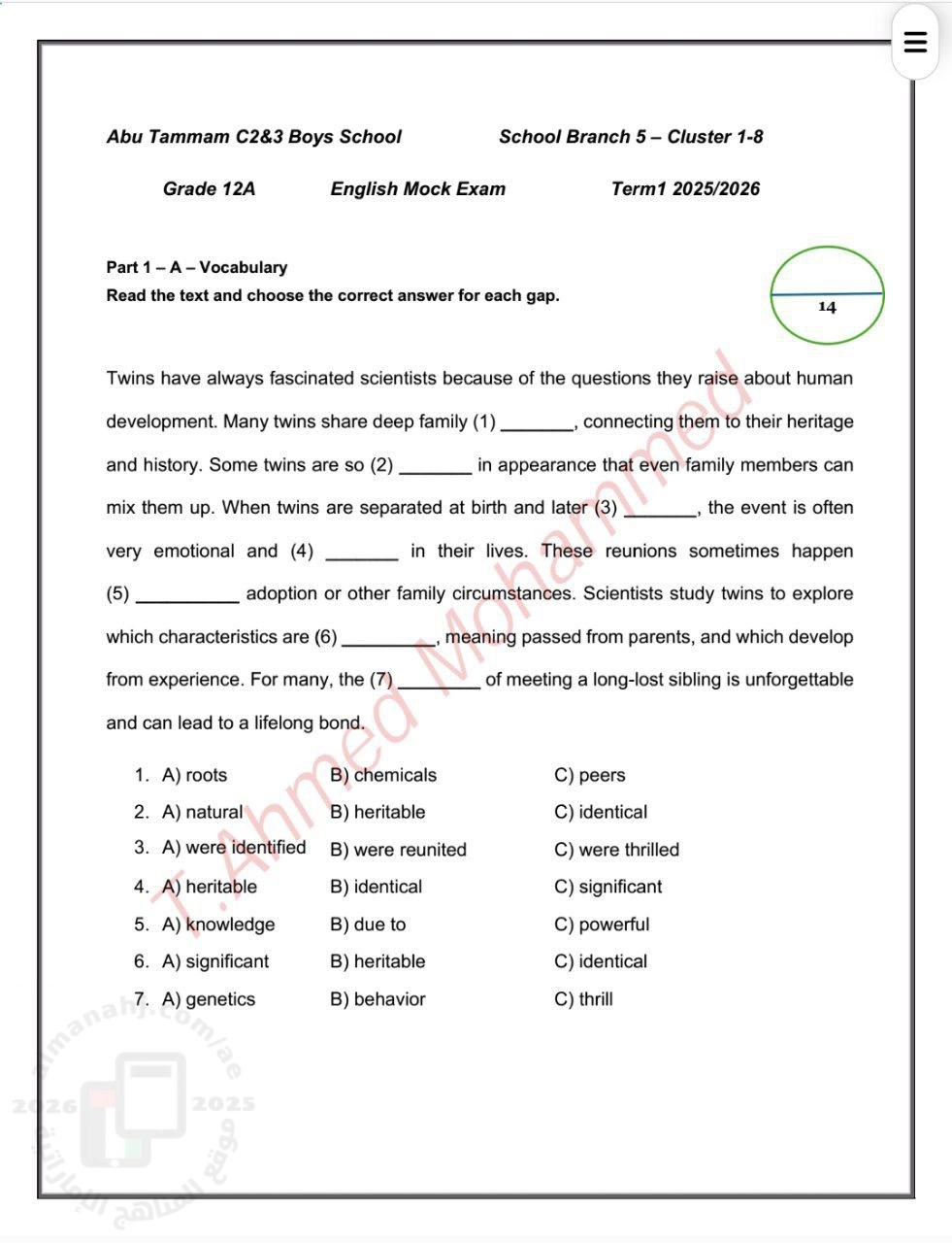 | نموذج اختبار تجريبي Mock Exam المسار المتقدم - إعداد: Ahmed Mohammed | ||