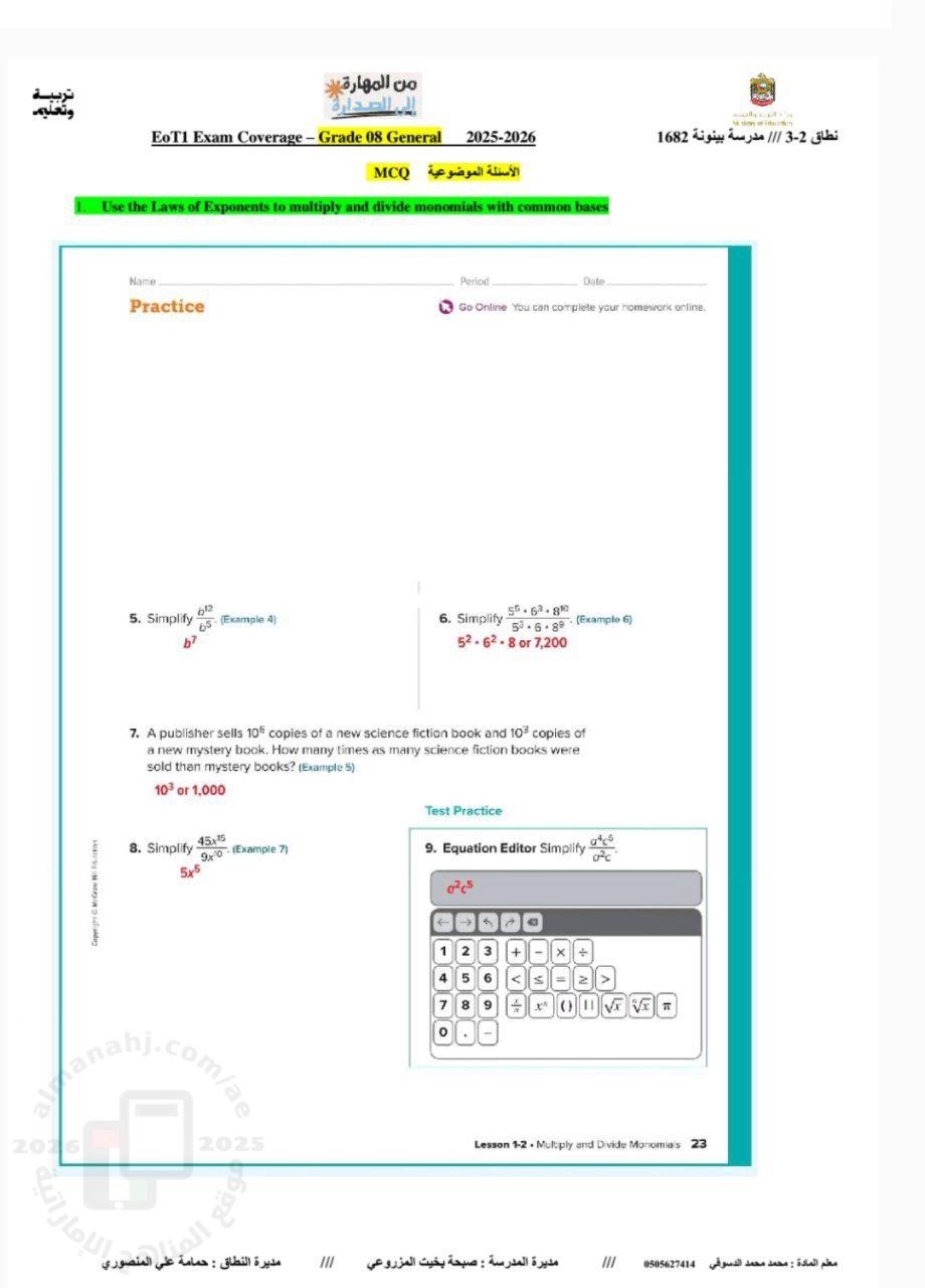 13. الصف التاسع العام, رياضيات, تجميعة نماذج تدريبية امتحانية وفق الهيكل الوزاري منهج بريدج