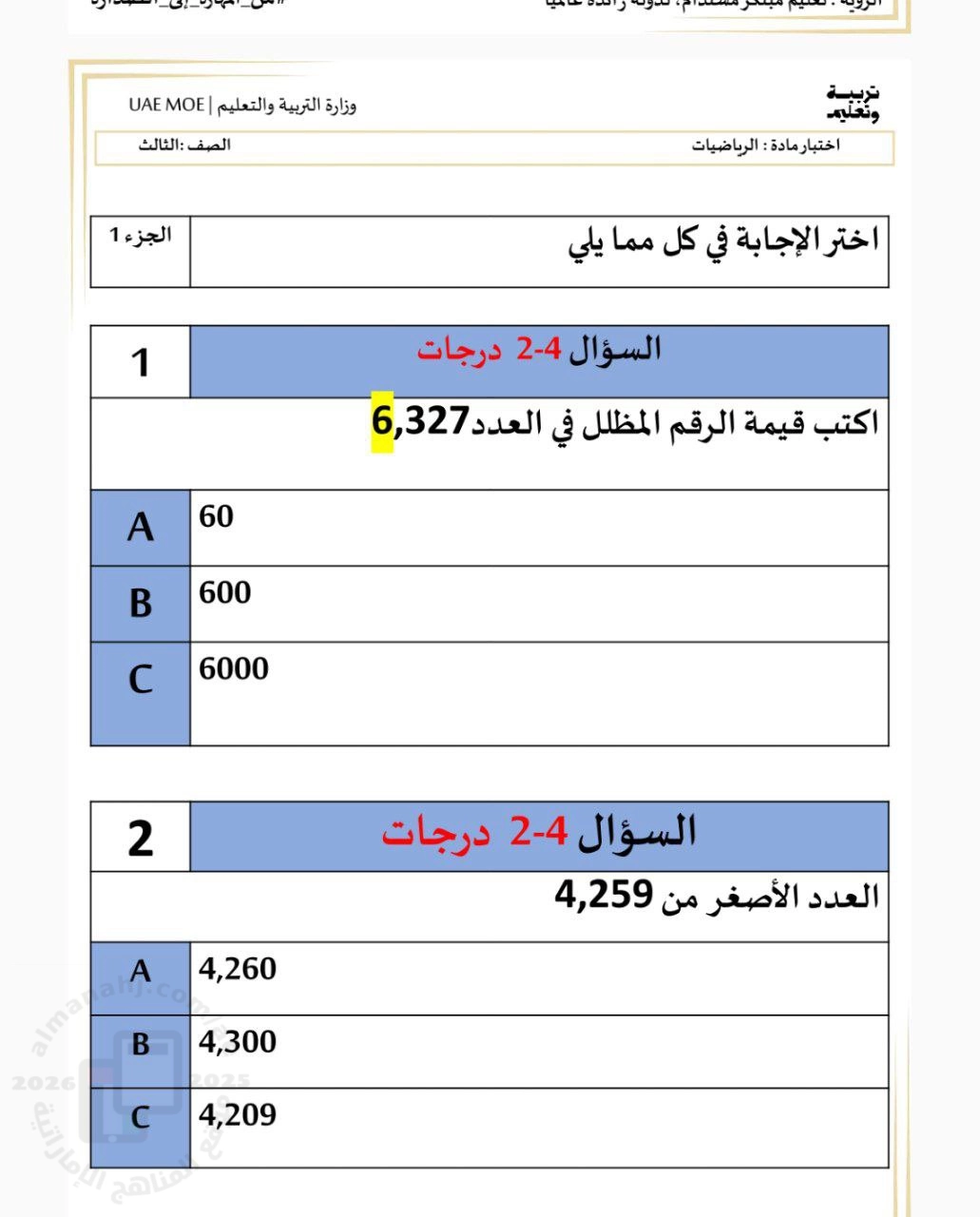 | أنت هنا: موقع المناهج ⇦ المناهج الإماراتية ⇦ الصف الثالث ⇦ رياضيات ⇦ الفصل الأول ⇦ اختبارات |