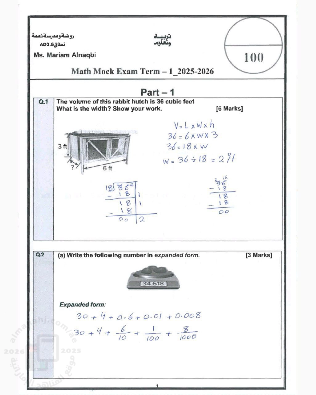 2. الصف الخامس, رياضيات, اختبار تجريبي هام وفق الهيكل الوزاري الجديد منهج ريفيل