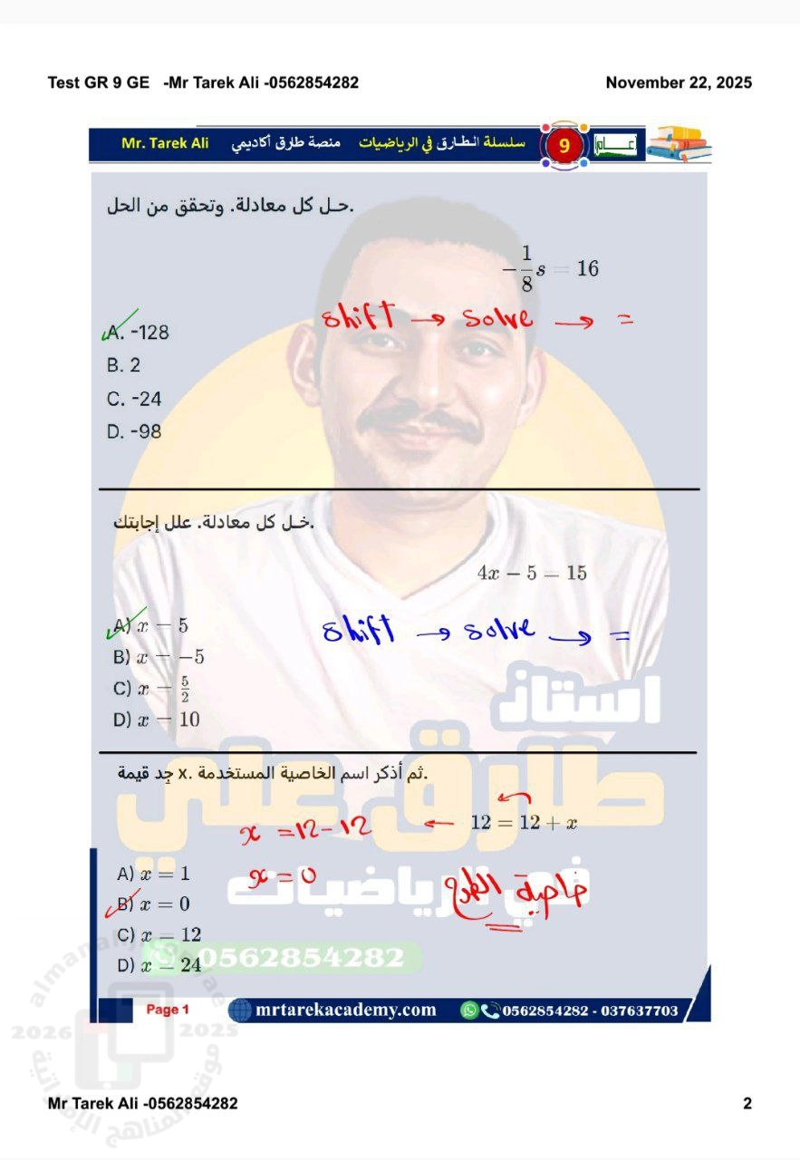 9. الصف الثامن, رياضيات, حل اختبار نهائي منهج بريدج المسار العام