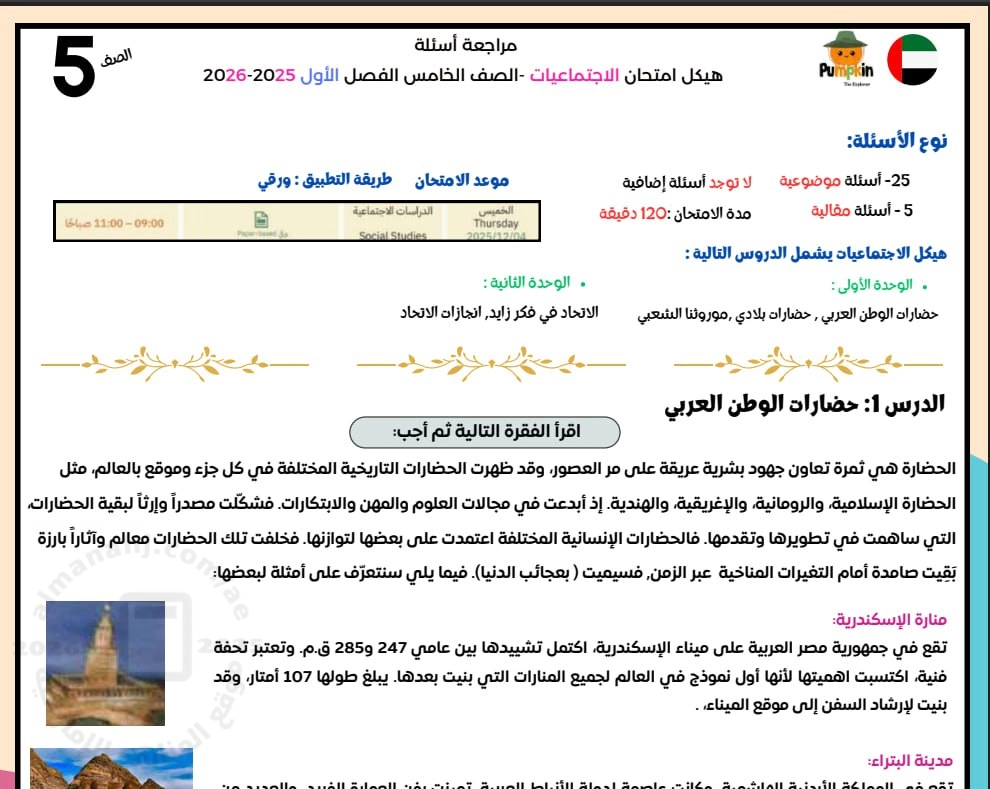 معلومات الملف: يحتوي هذا الملف على مراجعة أسئلة مادة هيكل امتحان الاجتماعيات -الصف الخامس الفصل الأول لجميع المستويات الفصل الأول 2025-2026 مع الحل ,ويضم أهم الدروس، والأسئلة المتوقعة، وتدريبات شاملة لتعزيز الفهم والاستعداد للامتحان. | ||
