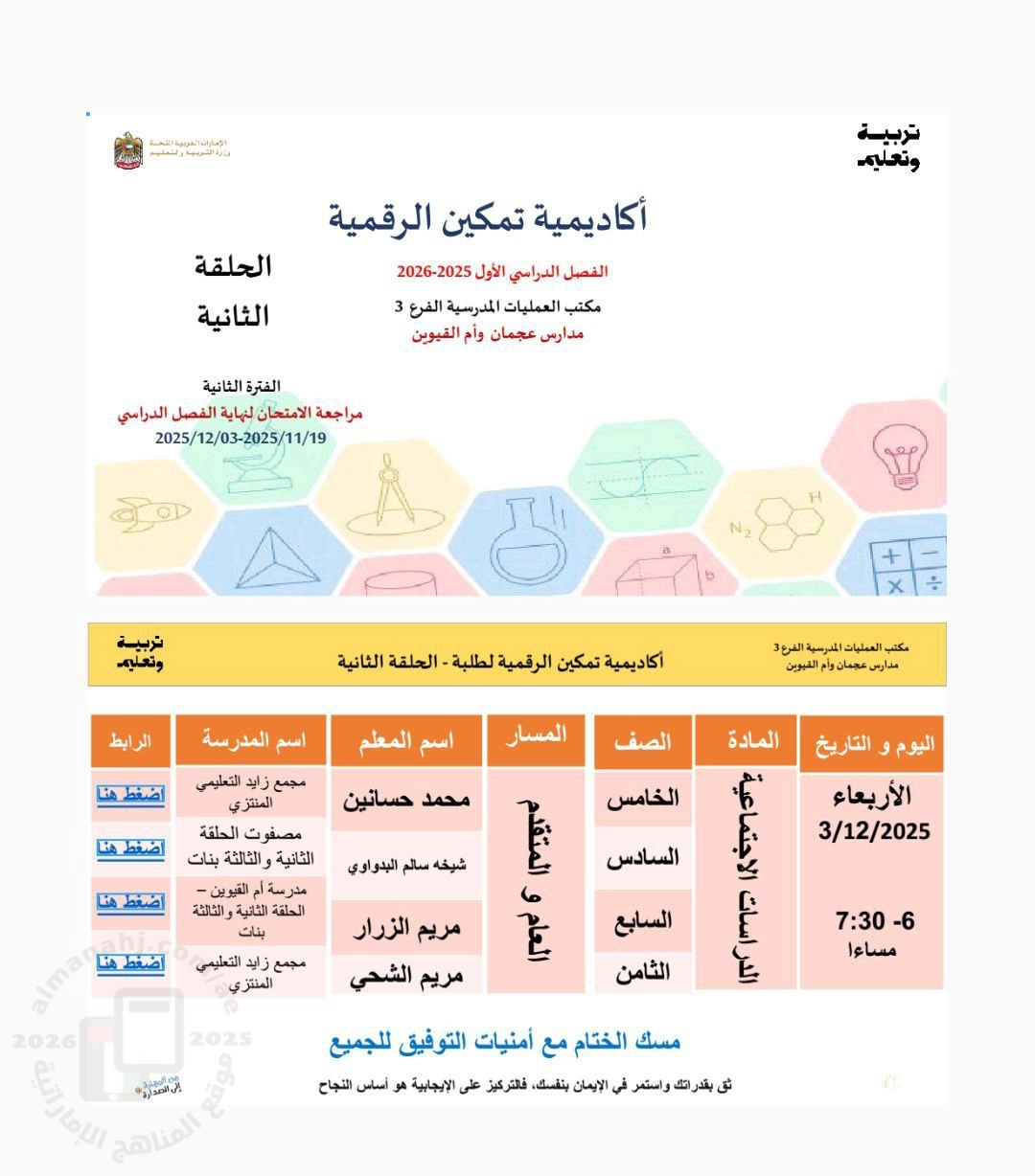 2. ملفات مدرسية, اجتماعيات, جدول حصص يوم الأربعاء 3 ديسمبر الحلقة الثانية من أكاديمية تمكين الرقمية