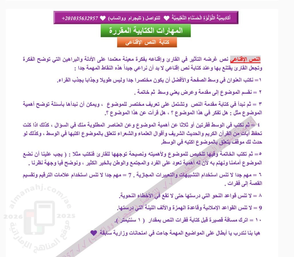 | مذكرة موضوعات الكتابة الإقناعية والسردية - إعداد: أكاديمية اللؤلؤة الحسناء التعليمية | ||
