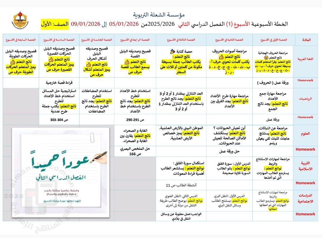 تم إيجاد الملف: الخطة الأسبوعية الأسبوع الأول جميع الصفوف من مؤسسة الشعلة التربوية