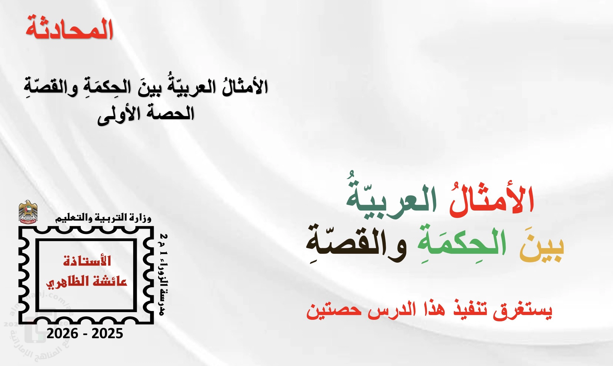 عرض بوربوينت درس الأمثال العربية بين الحكمة والقصة - الحصة الأولى والثانية, عائشة الظاهري, الصف السابع, لغة عربية, الفصل الثاني, 2025-2026 - المناهج الإماراتية
