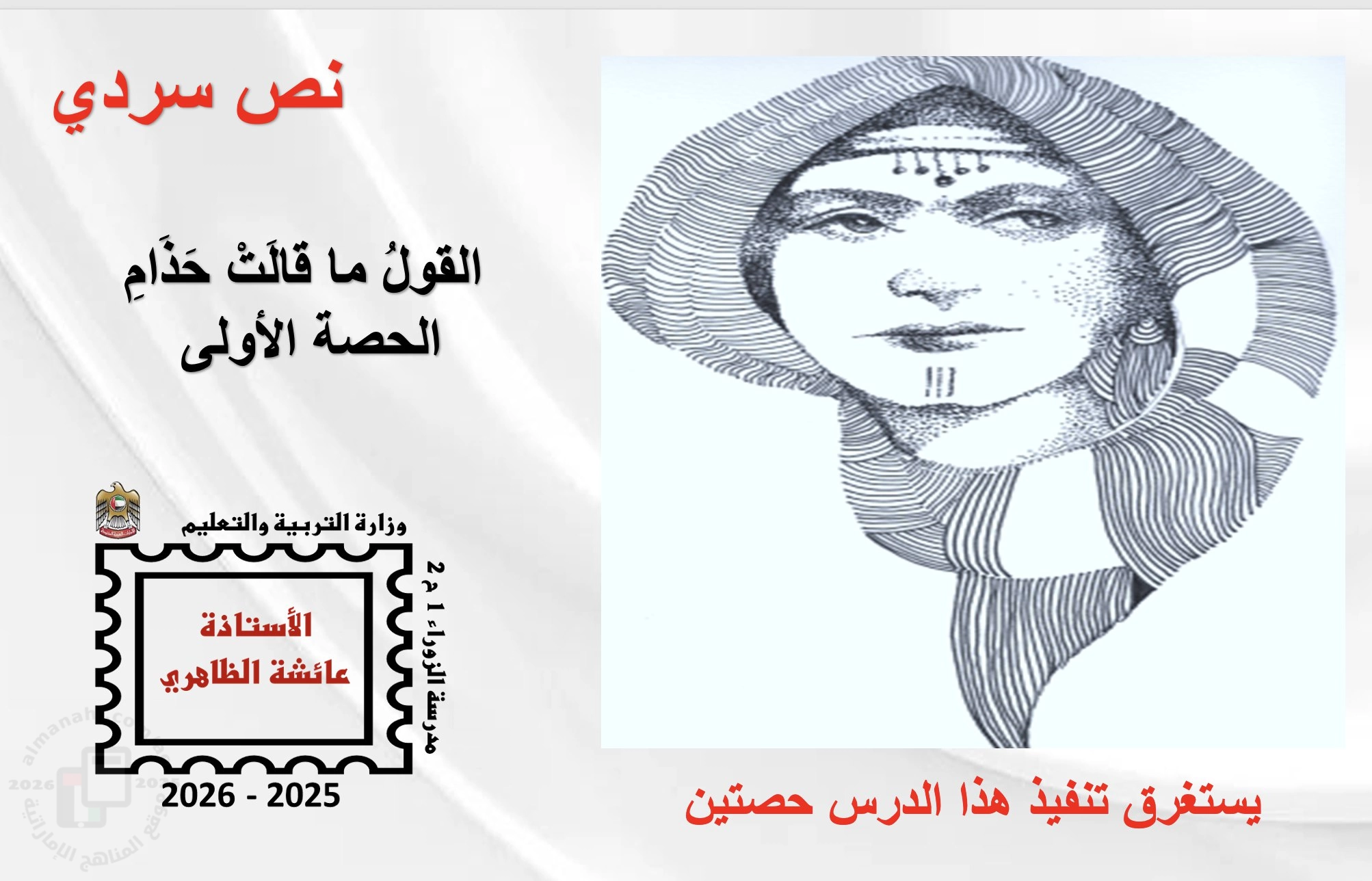 عرض بوربوينت نص سردي درس القول ماقالت حذام, عائشة الظاهري, الصف السابع, لغة عربية, الفصل الثاني, 2025-2026 - المناهج الإماراتية