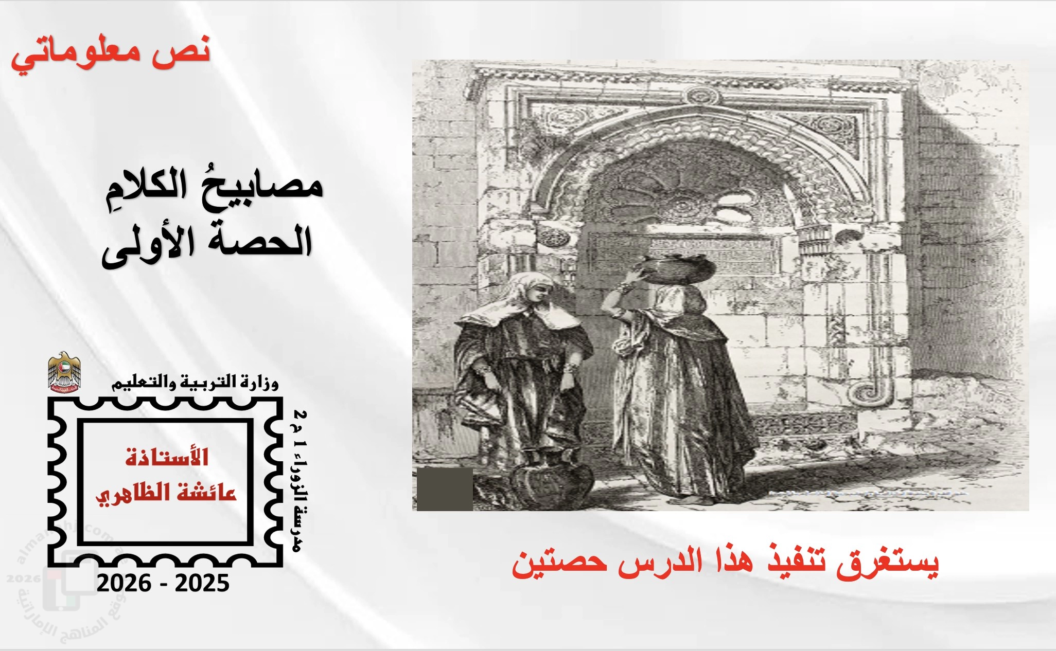 عرض بوربوينت نص معلوماتي درس مصابيح الكلام, عائشة الظاهري, الصف السابع, لغة عربية, الفصل الثاني, 2025-2026 - المناهج الإماراتية