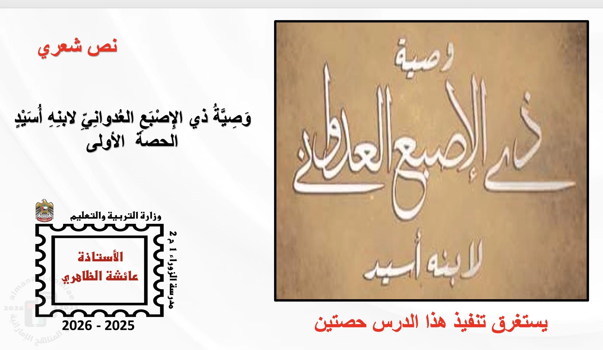 عرض بوربوينت نص شعري درس وصية دي الإصبع العدواني لابنه أسيد, عائشة الظاهري, الصف الثامن, لغة عربية, الفصل الثاني, 2025-2026 - المناهج الإماراتية