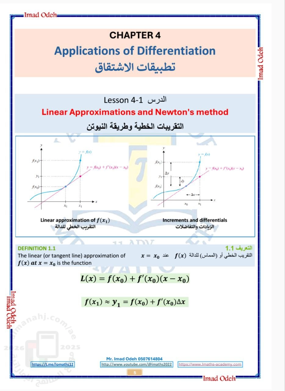 | ملخص دروس الوحدة الرابعة تطبيقات التفاضل والتكامل - إعداد: عماد عودة | ||