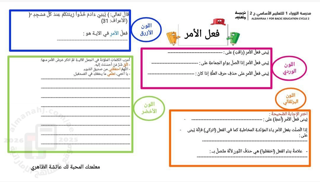 معلومات الملف: تتضمن ورقة العمل تمرينات متنوعة لفعل الأمر في اللغة العربية، حيث تبدأ بآية قرآنية لتحديد فعل الأمر فيها. | ||