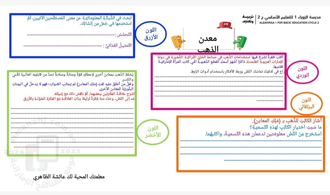 معلومات الملف: تتناول ورقة العمل معدن الذهب من خلال أنشطة متعددة تهدف إلى تنمية مهارات البحث والتحليل والتعبير. | ||