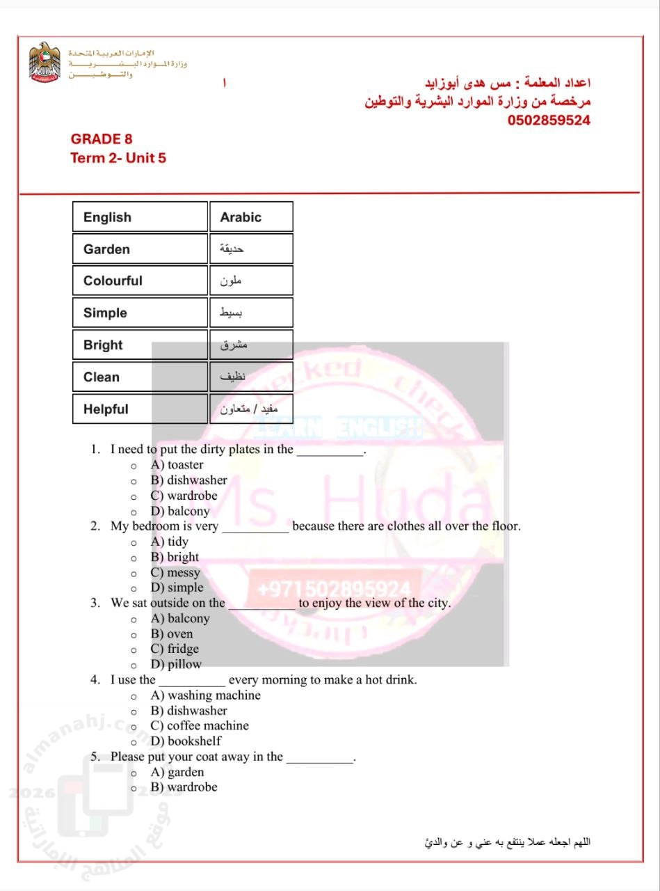 معلومات الملف: أوراق عمل الوحدة الخامسة Around the house شاملة بدون الحل | ||