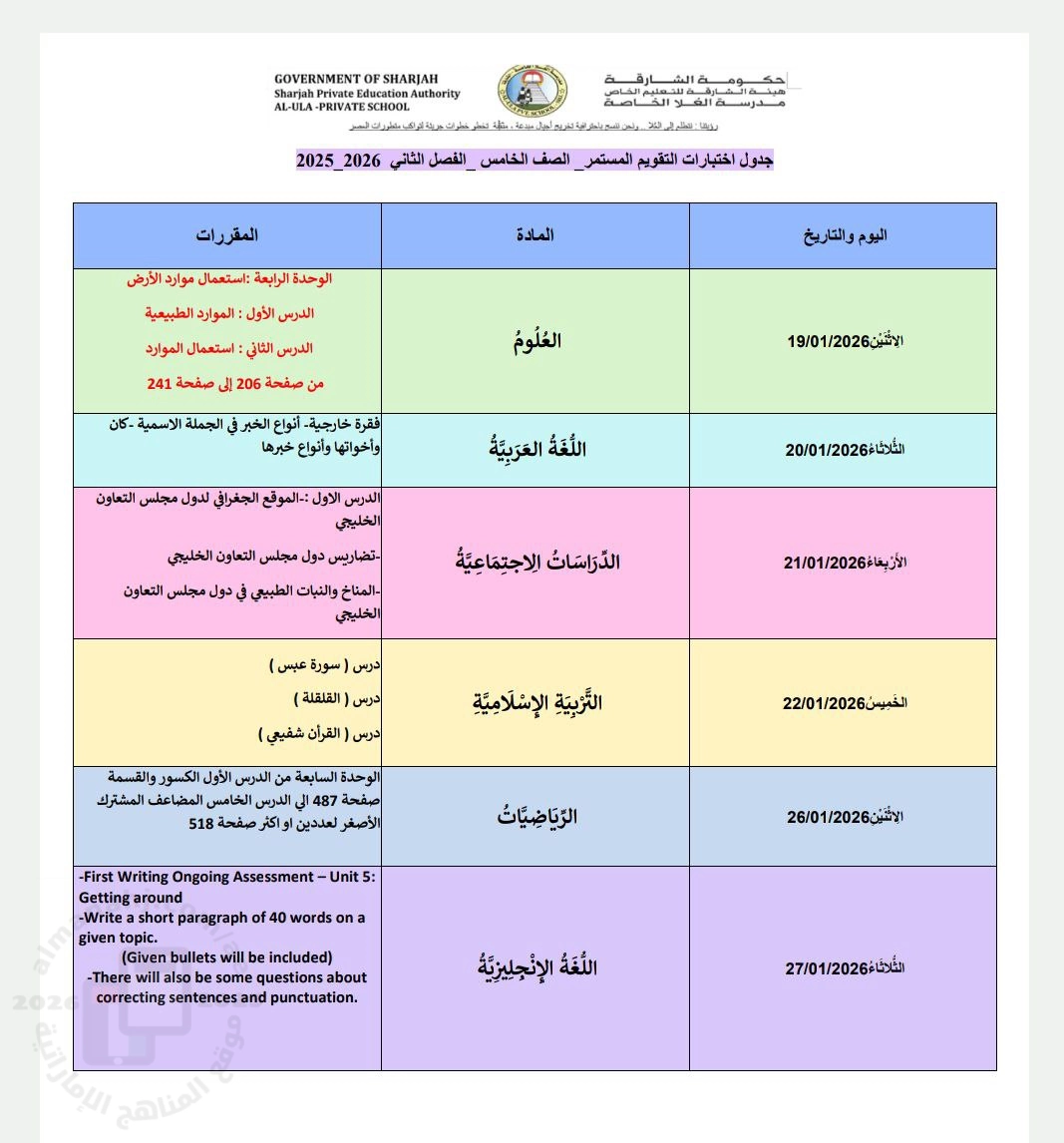 تم إيجاد الملف: جدول اختبارات التقويم المستمر من مدرسة العلا الخاصة
