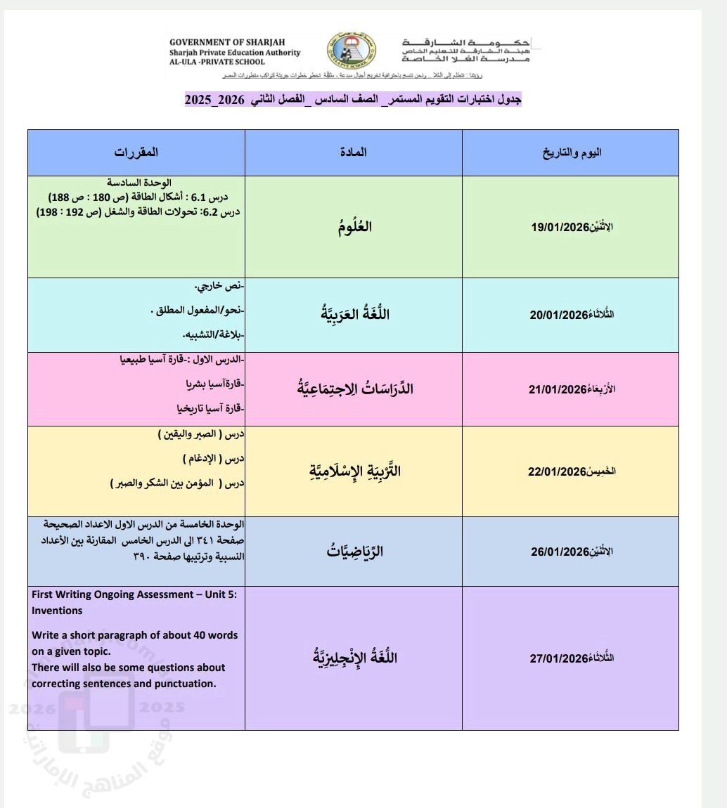 تم إيجاد الملف: جدول اختبارات التقويم الأول والمقررات المطلوبة من مدرسة العلا الخاصة