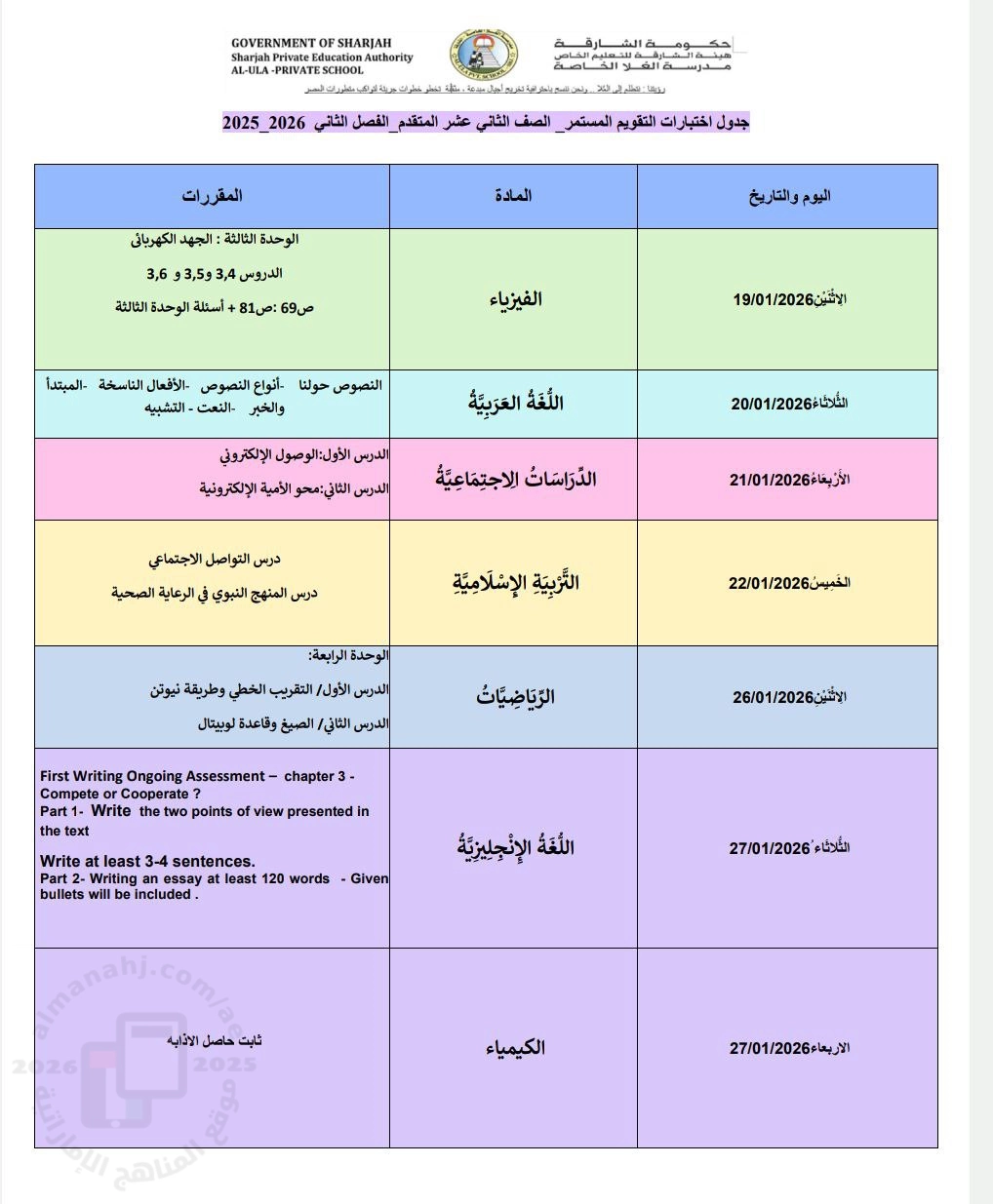 تم إيجاد الملف: جدول اختبارات التقويم الأول والمقررات المطلوبة من مدرسة العلا الخاصة