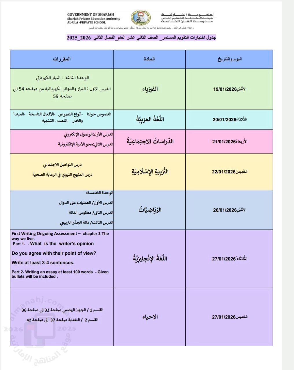 | أهلاً بكم جميعاً طلاباً ومدرسين وأهالي طلبة ومهتمين، في قسم دولة الإمارات ، نحن الآن في الفصل الثاني من العام الدراسي 2025/2026 وتاريخ اليوم 2026/01/13 م | |