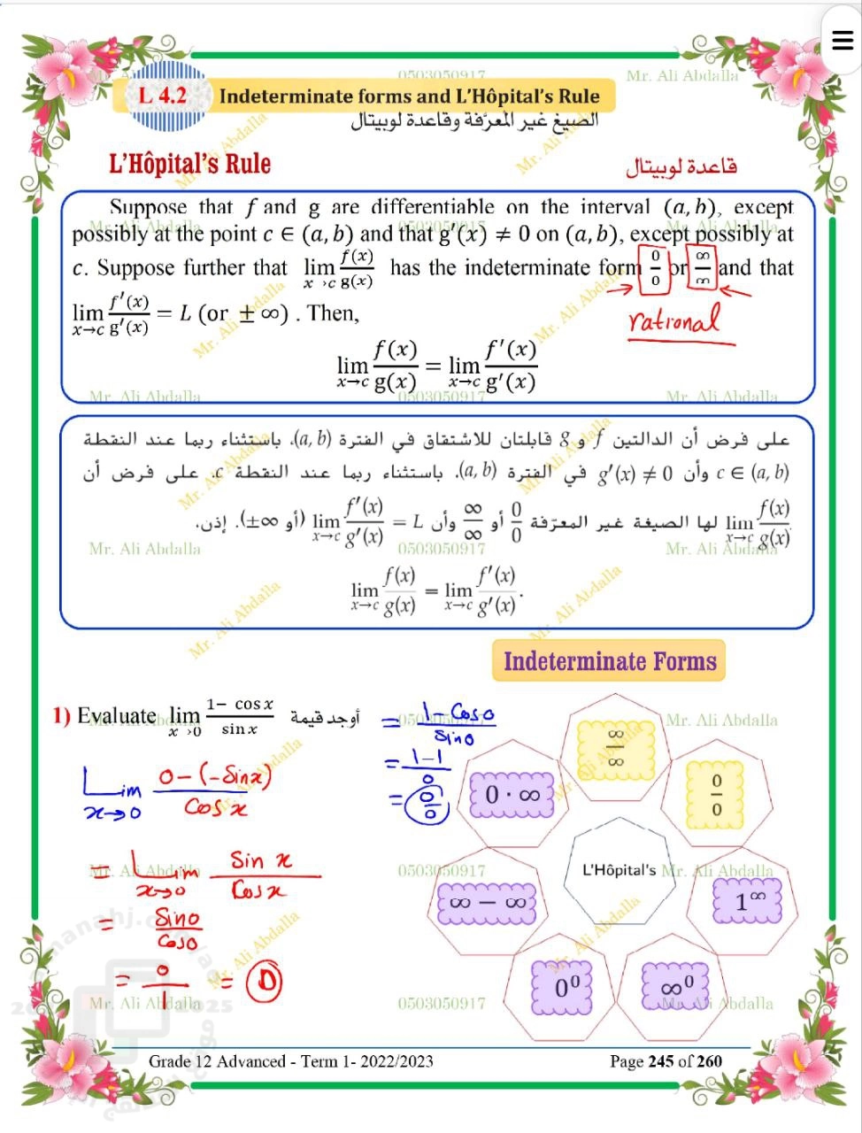 حل تدريبات الدرس الثاني الصيغ غير المعرفة وقاعدة لوبيتال من الوحدة الرابعة منهج ريفيل, علي عبد الله, الصف الثاني عشر العام, رياضيات, الفصل الثاني, 2025-2026, منهج انجليزي - المناهج الإماراتية