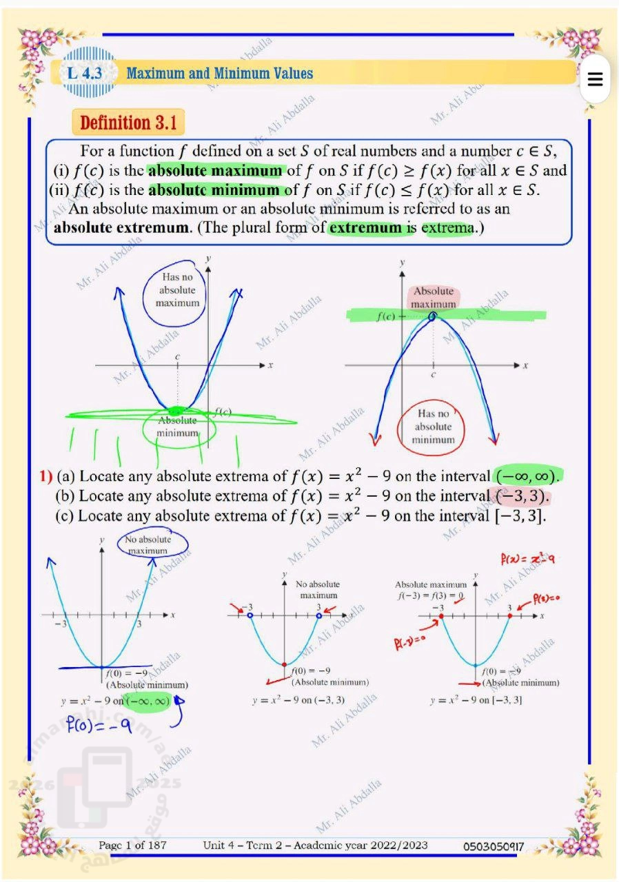 حل تدريبات الدرس الثالث Maximum and Minimun Values من الوحدة الرابعة منهج ريفيل, علي عبد الله, الصف الثاني عشر العام, رياضيات, الفصل الثاني, 2025-2026, منهج انجليزي - المناهج الإماراتية