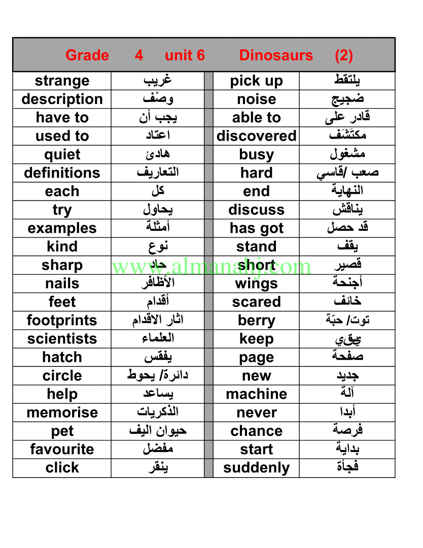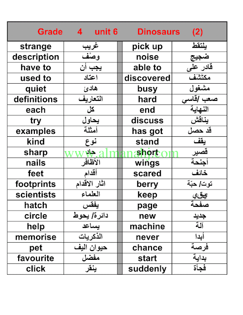 معلومات الملف: الصف الرابع, الفصل الثاني, لغة انكليزية, 2017-2018, مفردات وحدة الديناصورات | |||