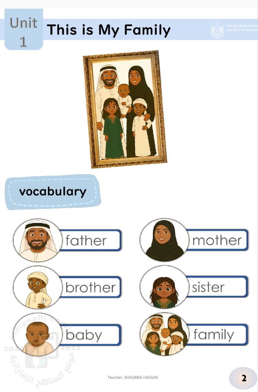 معلومات الملف: أوراق عمل الوحدة This is my family هذه عائلتي الأسبوع الأول و تشمل مايلي : المفردات Vocabulary | ||