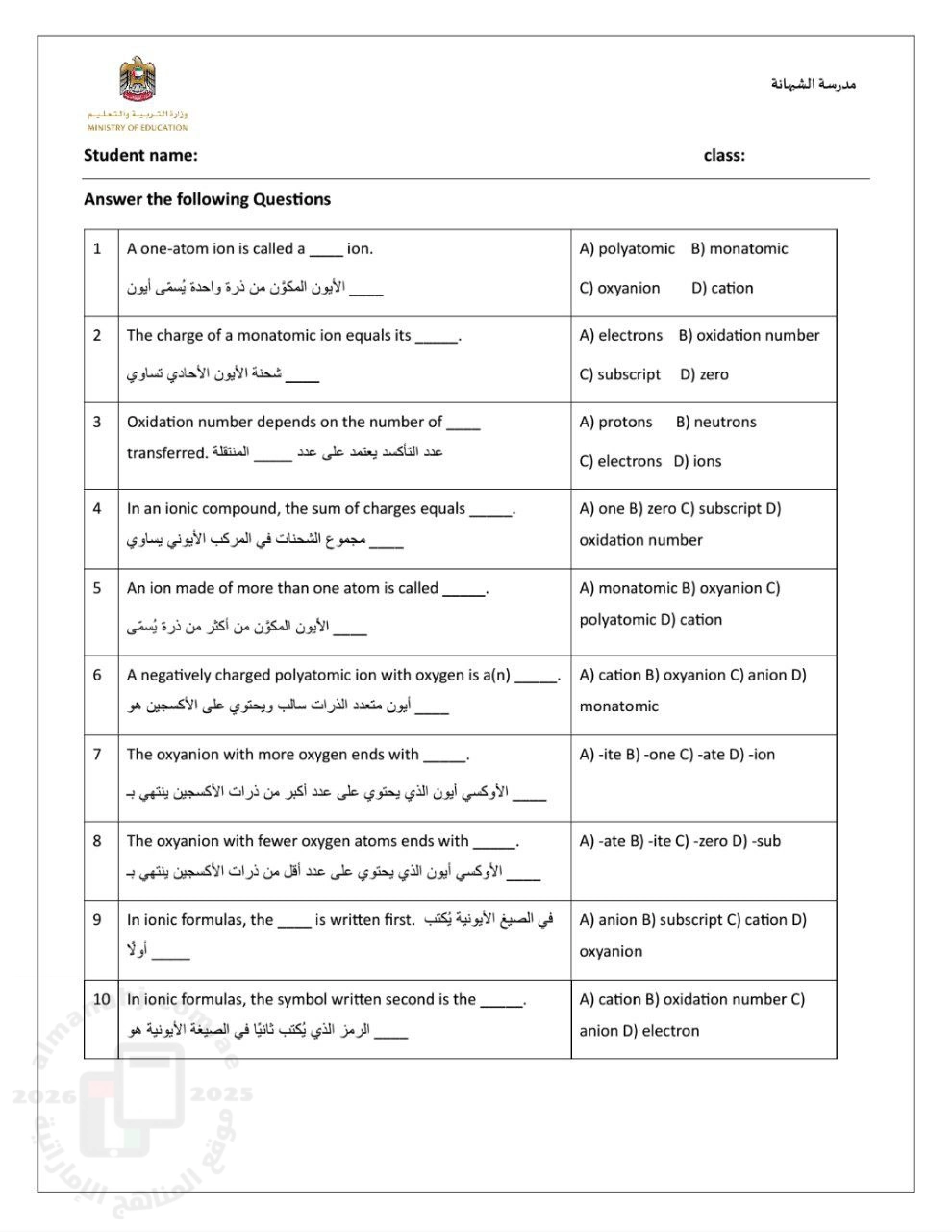 3. الصف الحادي عشر العام, كيمياء, أسئلة Quiz اختبار قصير اختيار من متعدد وكتابي