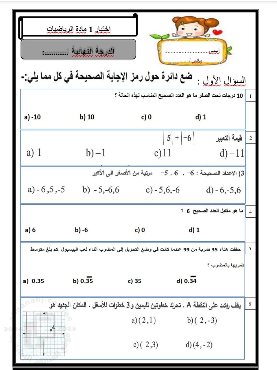 معلومات الملف: أسئلة اختبار قصير 1 منهج بريدج Bridge بدون الحل و يشمل أسئلة اختيار من متعدد حول الأعداد الصحيحة و مستوى الاحداثيات و تمثيل الأعداد على الخط البياني | ||