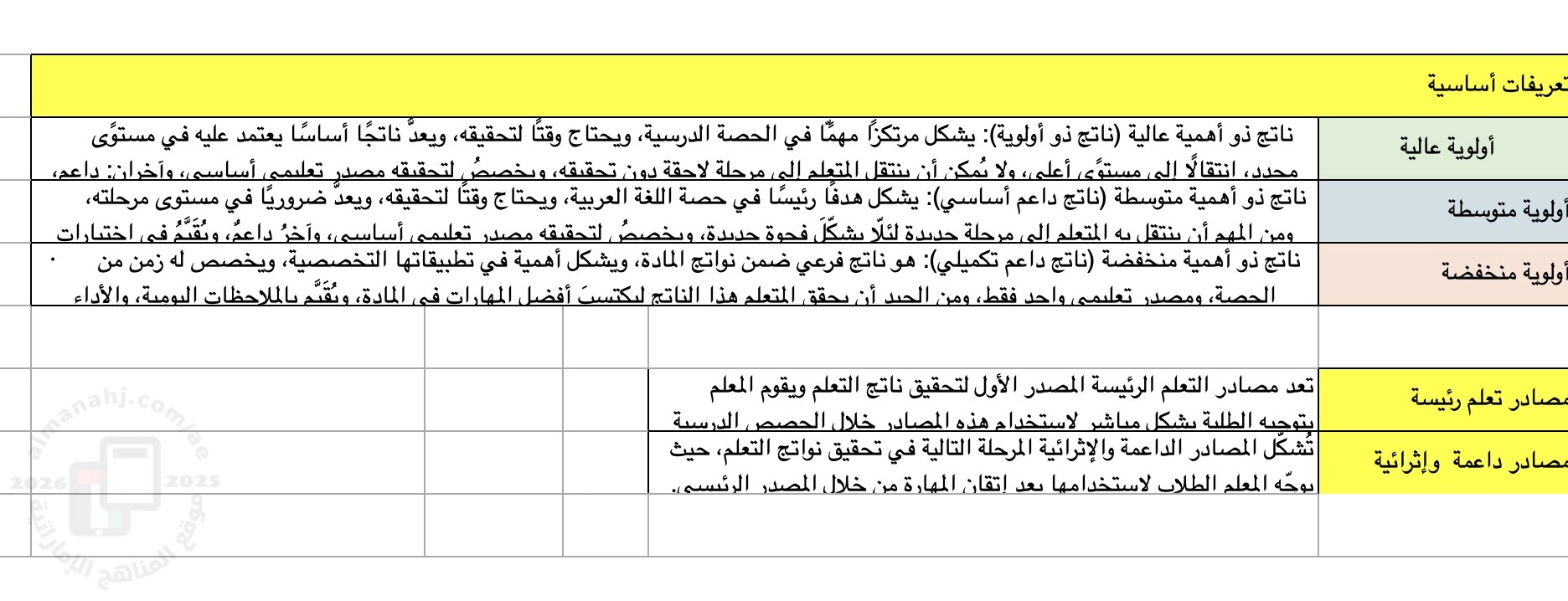 معلومات الملف: يعرض الملف إطارًا تنظيميًا لنواتج التعلّم المعتمدة للصف السادس، مع تصنيفها إلى ثلاث فئات رئيسة بحسب درجة الأهمية التربوية. تتمثل الفئة الأولى في نواتج ذات أولوية عالية، وهي النواتج الأساسية التي يُبنى عليها التعلم اللاحق، ويُعد إتقانها شرطًا ضروريًا لاستمرار تقدم الطالب أكاديميًا. أما نواتج الأولوية المتوسطة فهي نواتج داعمة تعزز الفهم وتُكمل النواتج الأساسية، لكنها أقل تأثيرًا في حال تعذر تحقيقها كاملة. يساعد هذا التقسيم المعلمين على اتخاذ قرارات تعليمية واعية، خاصة في حالات ضغط الوقت أو التعلم التعويضي، كما يضمن عدالة التركيز في التدريس والتقويم، ويخدم هدف رفع جودة المخرجات التعليمية للطلبة في الصف السادس. | ||