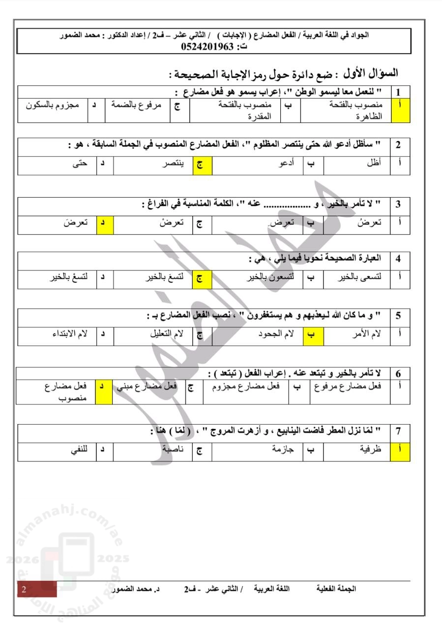 | إجابات ملخص واجب الجملة الفعلية (تمارين إثرائية - الفعل المضارع) - إعداد: محمد الضمور | ||
