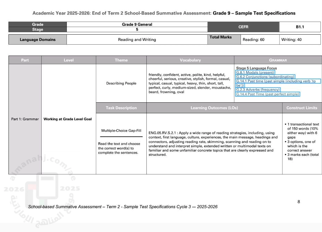 معلومات الملف: مواصفات الاختبار النهائي للفصل الثاني ( الهيكل الوزاري ) المسار العام Sample test specificatons School - based summative assessment End of term 2 Academic year 2025 - 2026 | ||