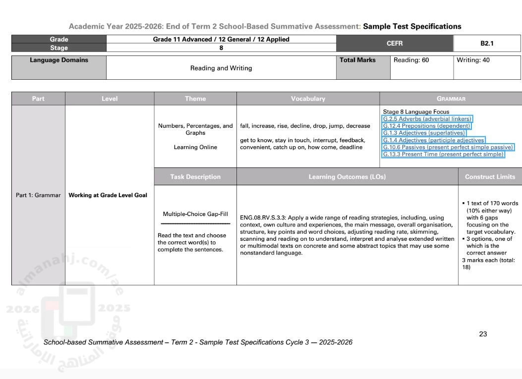 معلومات الملف: مواصفات الاختبار النهائي للفصل الثاني ( الهيكل الوزاري ) المسار العام Sample test specificatons School - based summative assessment End of term 2 Academic year 2025 - 2026 | ||