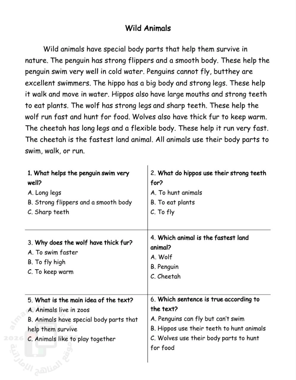 معلومات الملف: أوراق عمل Reading وحدة Wild Animals بدون الحل و تحتوي على عدة نصوص قرائية مع أسئلة اختيار من متعدد بدون إجابات | ||