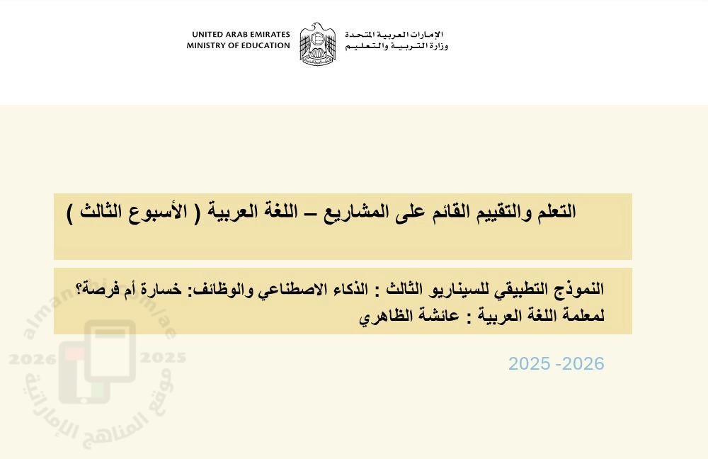 معلومات الملف: تقديم الحلول النموذج التطبيقي للسيناريو الثالث : الذكاء الاصطناعي والوظائف خسارة أم فرصة ? - التعلم القائم على المشاريع و التقييم ( الأسبوع الثالث ) نواتج التعلم : يكتب نصوصاً تعكس وجهة نظر متماسكة، وأدلة منطقية، ونهاية واضحة موظفاً في كتابته التماسك النصي بين الفقرات من خلال عبارات انتقالية مناسبة يستخدم استراتيجية تسجيل الملاحظات والتخطيط والتظليل والتلخيص، لينظم مسوداته قبيل تبييضها مطبقاً آليات المراجعة يقترح حلولاً لمشكلات حياتية في ضوء معلومات قرأها يكتب تقريراً بحثياً عن فكرة أو قضية مهمة، ويطرح سؤالاً مركزياً مؤسساً لفكرة أساسية يقدم عرضاً شفوياً إقناعياً منظماً عن ظاهرة أو مشكلة يعرض فيه الأسباب والنتائج، مقترحاً حلاً أو أكثر، مستخدماً استراتيجيات الكلام المتضمنة ضبط التنغيم، ووضوح الصوت، وتوقيت الكلام، والاتصال البصري، معبراً عن وجهة نظره في المادة المعروضة يعرض نصاً معلوماتياً بأشكال مرئية أو باستخدام الوسائط المتعددة شارحاً كيف تسهم تلك المعينات في توضيح الموضوع يعرض النتائج طباعة وبوسائط متعددة ، موثقاً المصادر والمراجع. ملاحظة: سيظهر توظيف هذه النواتج في المراحل المناسبة على شكل أنشطة لغوية مدمجة في مهام المشروع (استماع – قراءة – كتابة – عرض شفهي – استخدام وسائط). | ||