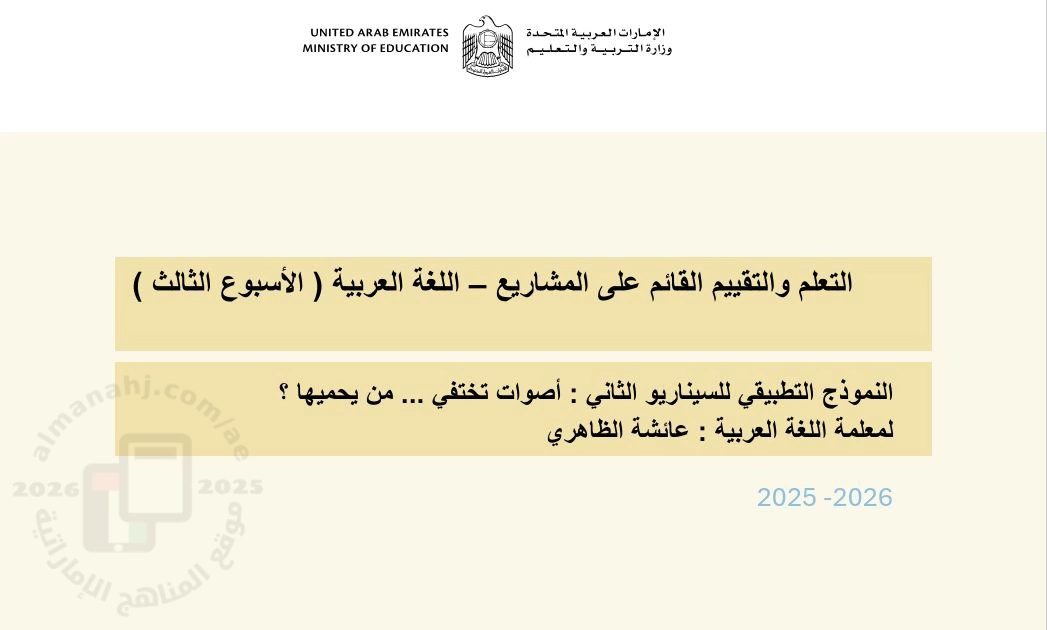 معلومات الملف: العنوان تقديم الحلول النموذج التطبيقي للسيناريو الثاني : أصوات تختفي ... نواتج التعلم : يكتب نصوصاً تعكس وجهة نظر متماسكة، وأدلة منطقية، ونهاية واضحة موظفاً في كتابته التماسك النصي بين الفقرات من خلال عبارات انتقالية مناسبة يستخدم استراتيجية تسجيل الملاحظات والتخطيط والتظليل والتلخيص، لينظم مسوداته قبيل تبييضها مطبقاً آليات المراجعة يقترح حلولاً لمشكلات حياتية في ضوء معلومات قرأها يكتب تقريراً بحثياً عن فكرة أو قضية مهمة، ويطرح سؤالاً مركزياً مؤسساً لفكرة أساسية يقدم عرضاً شفوياً إقناعياً منظماً عن ظاهرة أو مشكلة يعرض فيه الأسباب والنتائج، مقترحاً حلاً أو أكثر، مستخدماً استراتيجيات الكلام المتضمنة ضبط التنغيم، ووضوح الصوت، وتوقيت الكلام، والاتصال البصري، معبراً عن وجهة نظره في المادة المعروضة يعرض نصاً معلوماتياً بأشكال مرئية أو باستخدام الوسائط المتعددة شارحاً كيف تسهم تلك المعينات في توضيح الموضوع يعرض النتائج طباعة وبوسائط متعددة ، موثقاً المصادر والمراجع. ملاحظة: سيظهر توظيف هذه النواتج في المراحل المناسبة على شكل أنشطة لغوية مدمجة في مهام المشروع (استماع – قراءة – كتابة – عرض شفهي – استخدام وسائط). | ||