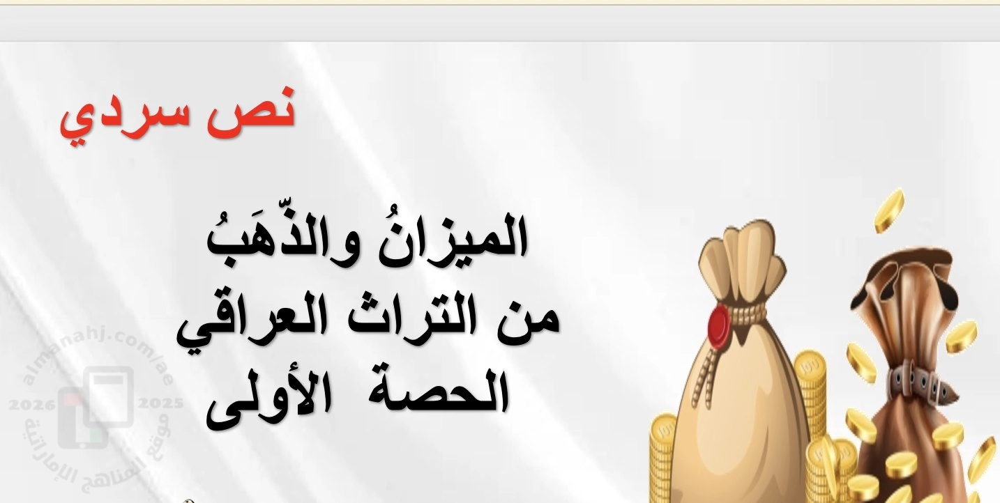 اضغط هنا لتحميل وعرض ( عرض بوربوينت نص سردي درس الميزان والذهب من التراث العراقي )