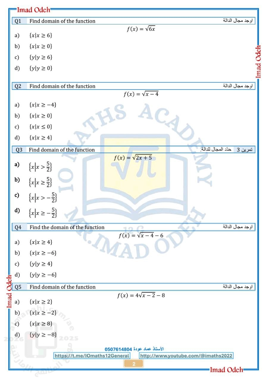 | مراجعة الدرس الثالث دوال الجذر التربيعي والمتباينات من الوحدة الرابعة منهج بريدج وريفيل (اختبر نفسك 3) - إعداد: عماد عودة | ||