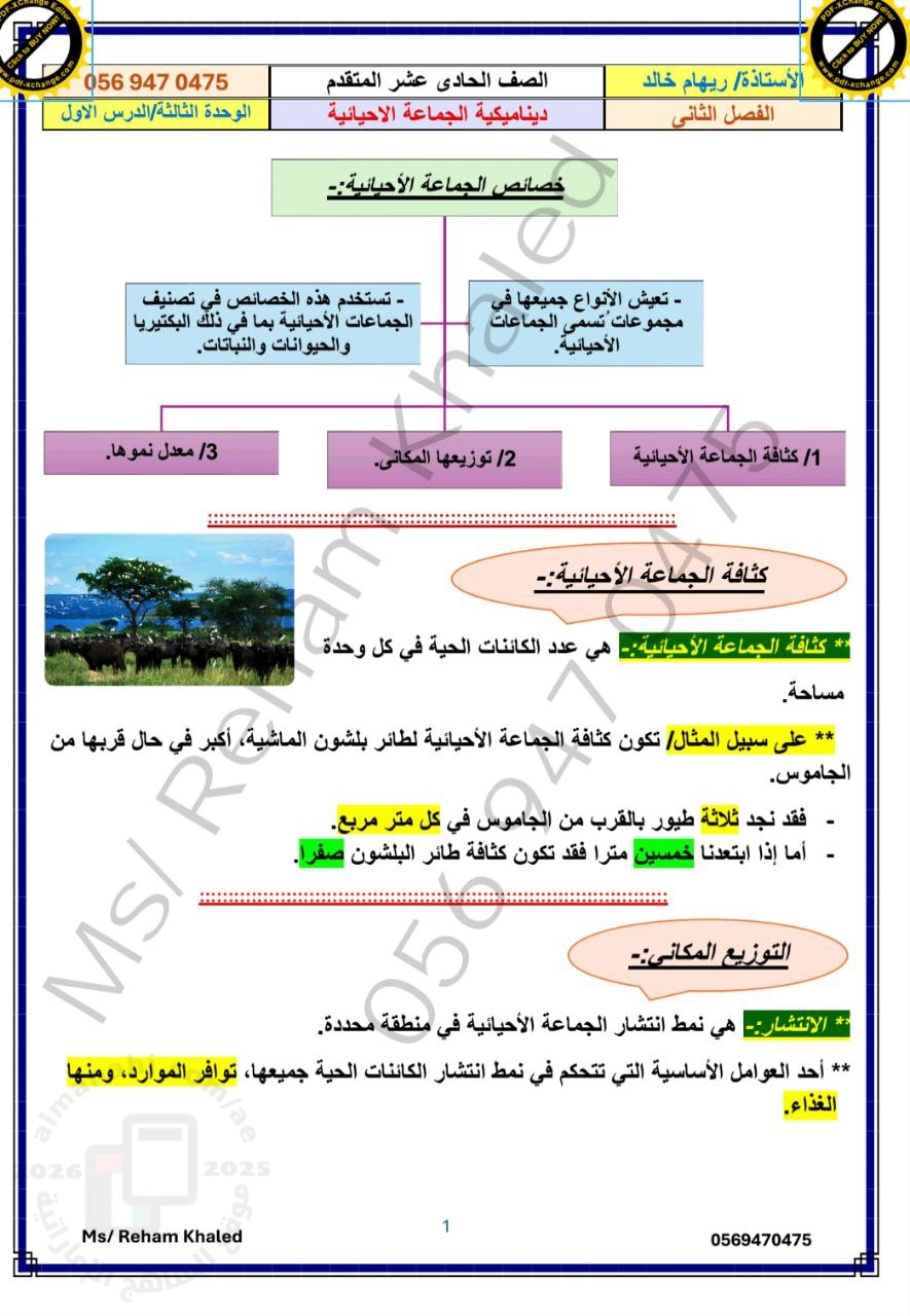 معلومات الملف: ملخص و أوراق عمل الدرس الأول ديناميكية الجماعة الإحيائية من الوحدة الثالثة منهج بريدج Bridge الجماعة الأحيائية: هي مجموعة من الأفراد من نفس النوع تعيش في منطقة محددة. 1. الكثافة: عدد الأفراد لكل وحدة مساحة. · تعتمد على الكثافة: مثل التنافس والمرض والافتراس. نماذج النمو: · النمو الأسي (شكل J): يحدث عند توفر موارد غير محدودة. تأثير الإنسان: أسئلة التقييم: | |||