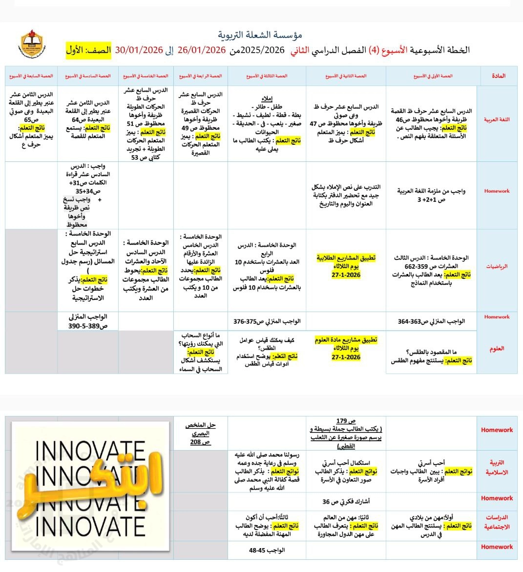 معلومات الملف: فيما يلي نسخة من الخطط الأسبوعية لطلابنا الأعزاء وأولياء أمورهم الكرام ، للصفوف من ( الروضة حتى الثاني عشر ) الأسبوع الرابع من الفصل الدراسي الثاني من الأثنين : 26-01-2026 | ||