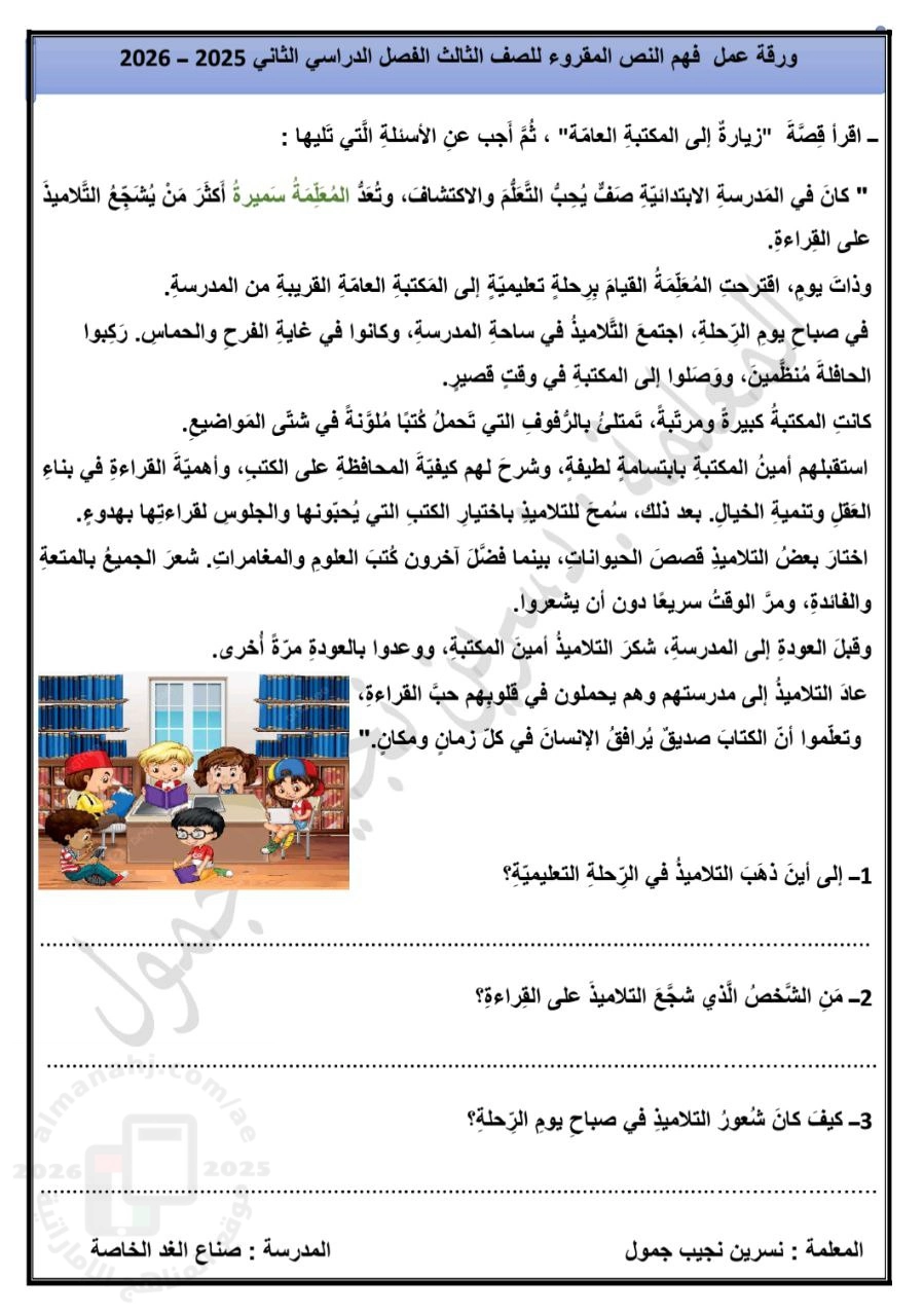 | ورقة عمل فهم النص المقروء (زيارة إلى المكتبة العامة) - إعداد: نسرين نجيب جمول | ||