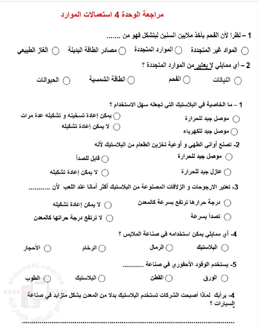 معلومات الملف: مراجعة شاملة الوحدة الرابعة استعمالات الموارد الطبيعية بدون الحل تلخيص مراجعة الوحدة الرابعة: استعمال الموارد · غير متجددة: الفحم، النفط، الغاز الطبيعي، المعادن (الحديد، النحاس، الذهب) – تتطلب ملايين السنين للتشكل. ثانياً: البلاستيك · مصنوع من الوقود الأحفوري (النفط). ثالثاً: النسيج والألياف · مصادر طبيعية: · مصادرها: الشمس، الرياح، المياه المتحركة. · إغلاق الأجهزة الإلكترونية عند عدم الاستخدام. سادساً: تطبيقات عملية · الخلايا الشمسية: توليد الكهرباء من الشمس. | ||